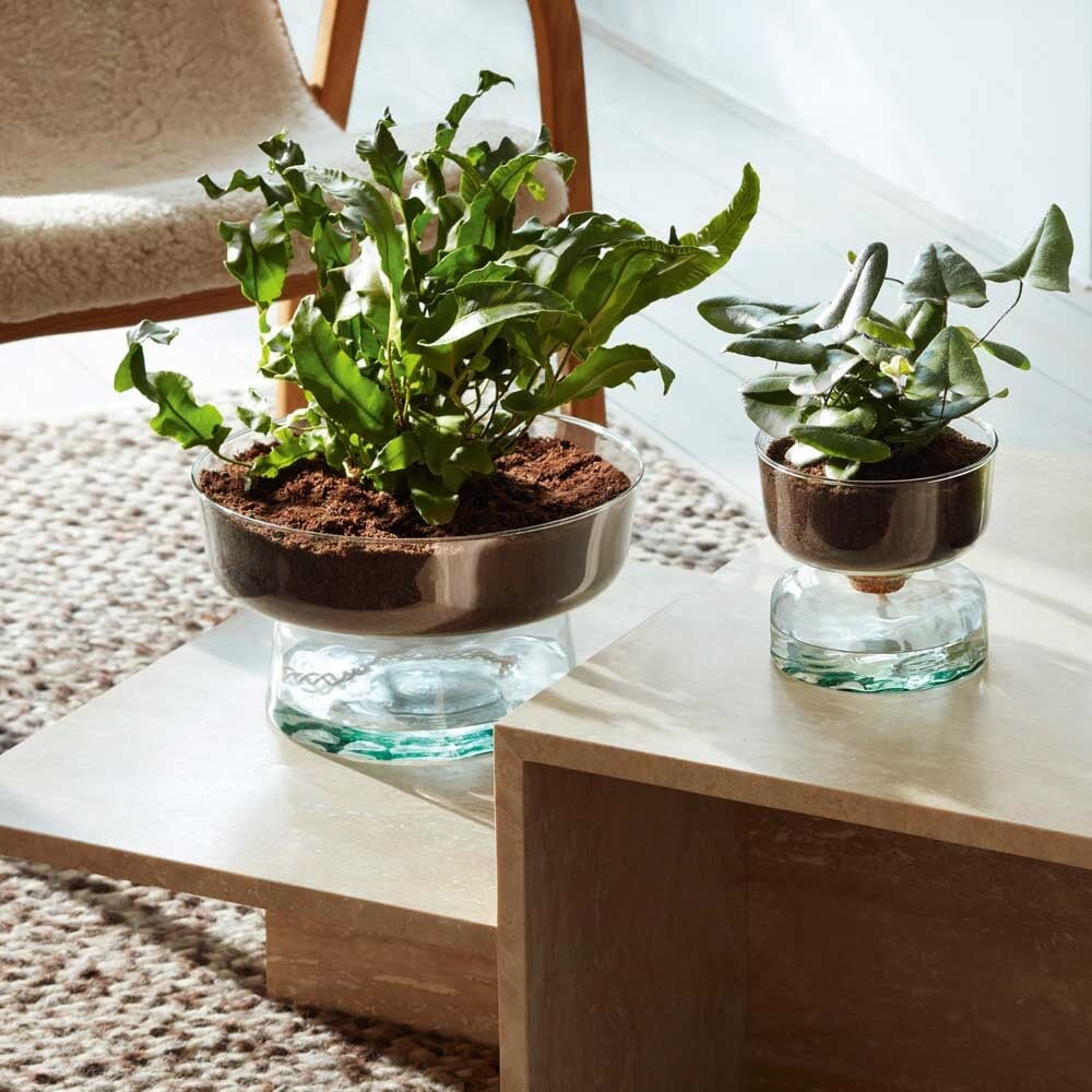 100%再資源化可能なリサイクルガラスを使用しているサステナブルな自己給水プランターです。