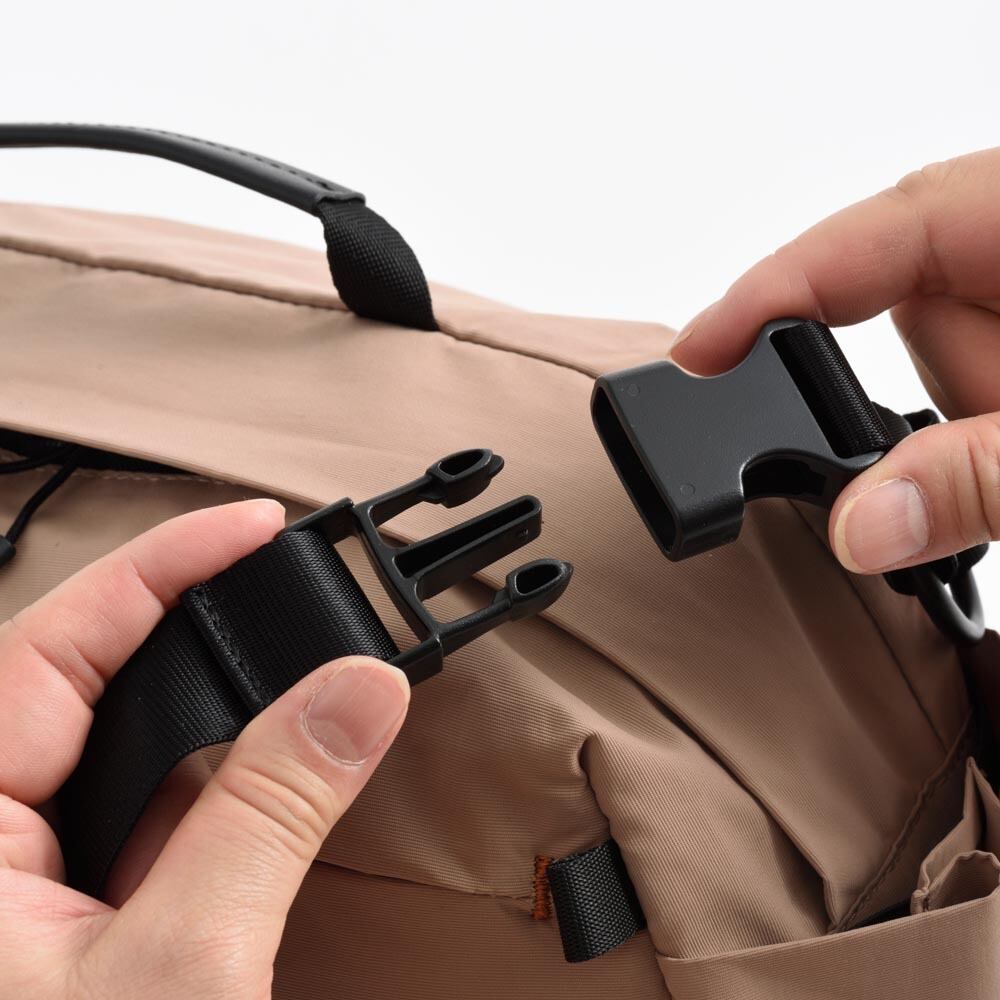 ショルダーストラップにはバックルがついているので、わざわざ肩を通さなくても着脱可能。