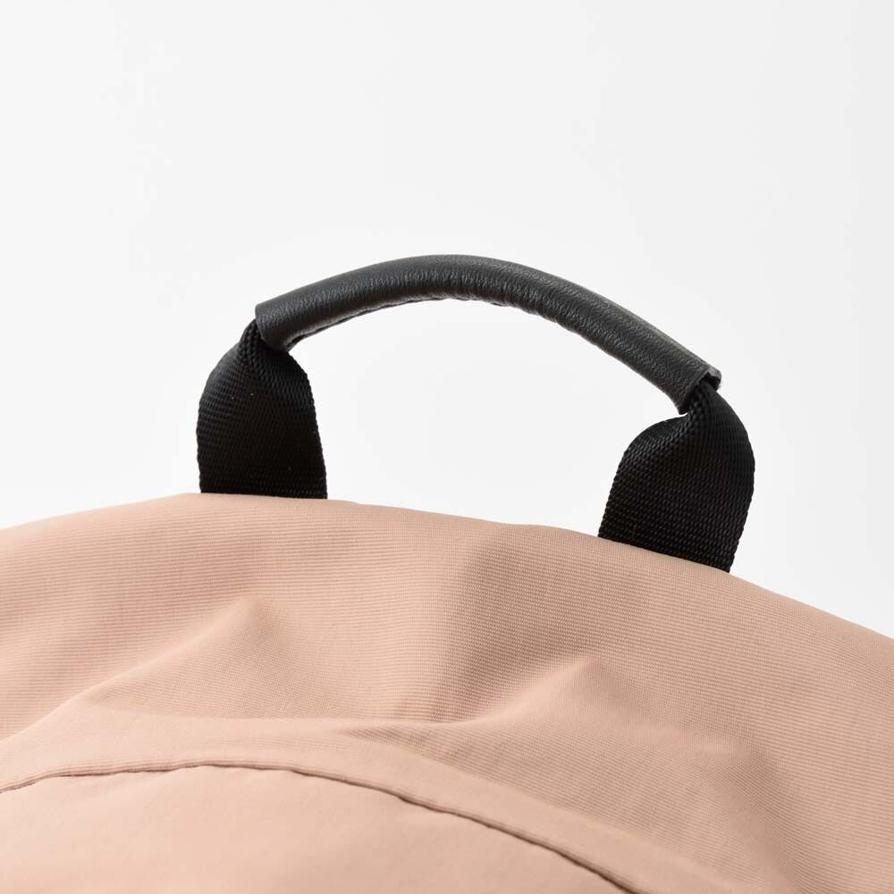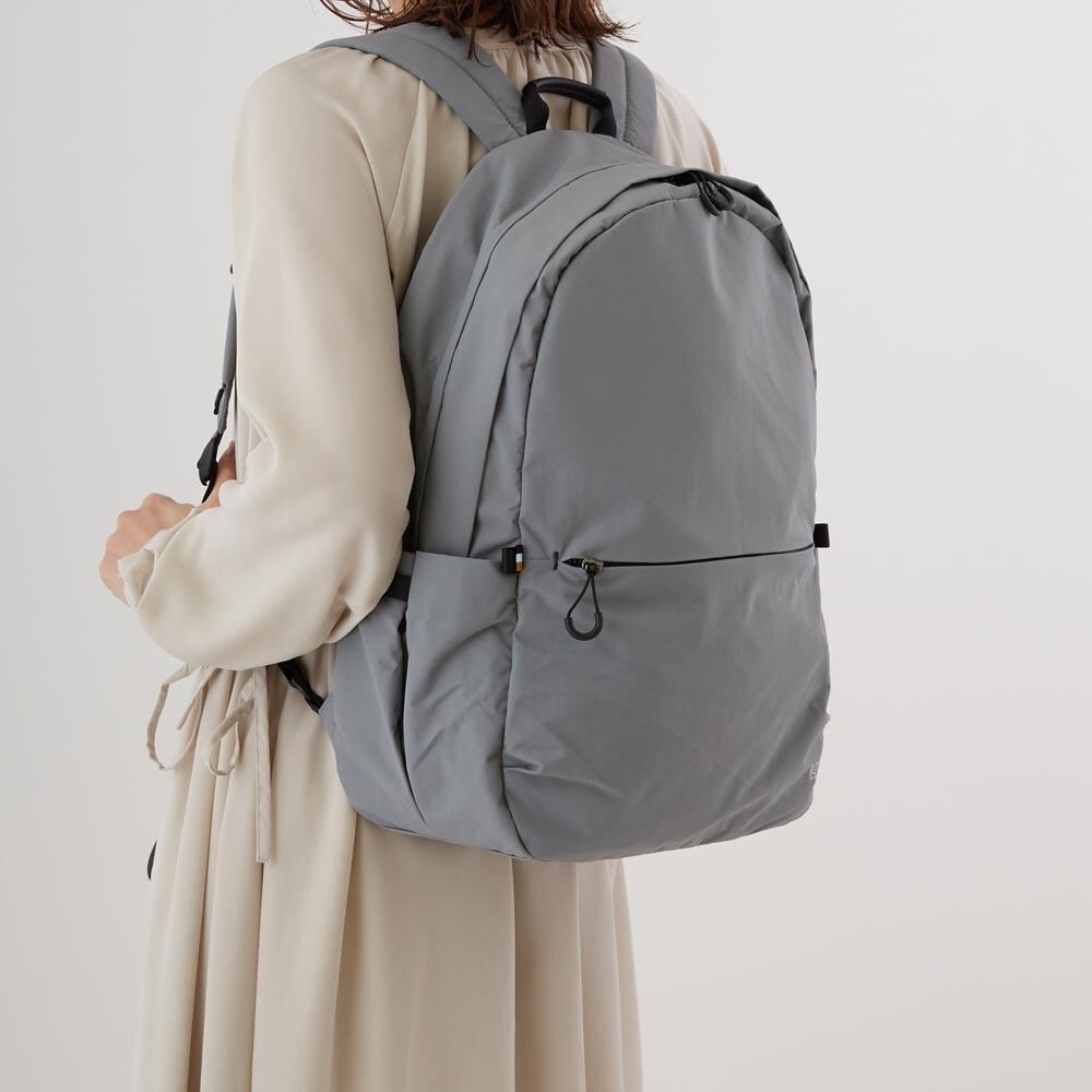 外装にはすぐ取り出したい物の収納に便利なフロントポケット、ペットボトルや傘を収納できる両サイドのポケット、背負ったまま物を出し入れできる背面のファスナーポケットを搭載し、ミニマルなデザインとは裏腹に使い勝手を考え抜かれたポケットの配置が魅力です。