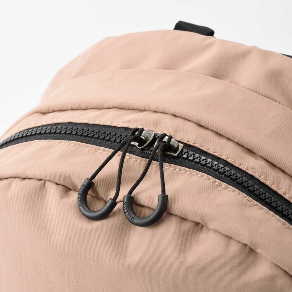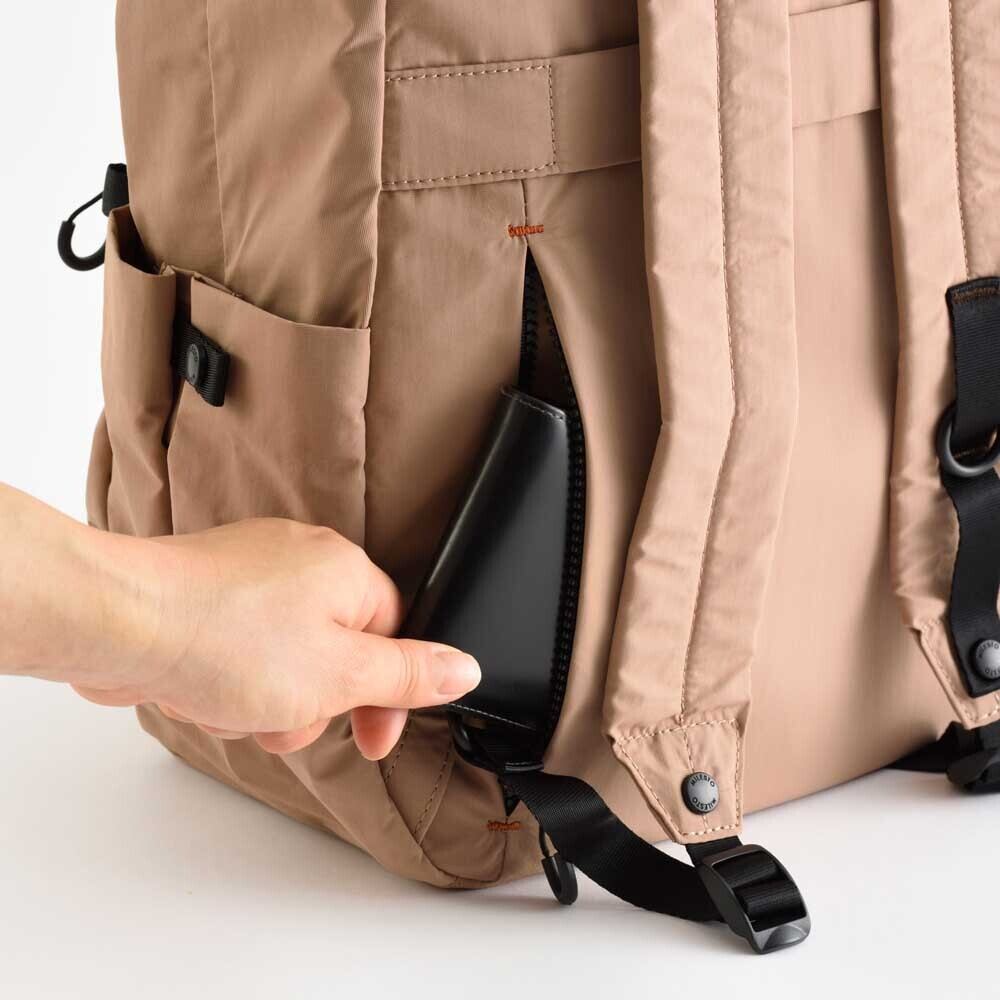 外装にはすぐ取り出したい物の収納に便利なフロントポケット、ペットボトルや傘を収納できる両サイドのポケット、背負ったまま物を出し入れできる背面のファスナーポケットを搭載し、ミニマルなデザインとは裏腹に使い勝手を考え抜かれたポケットの配置が魅力です。