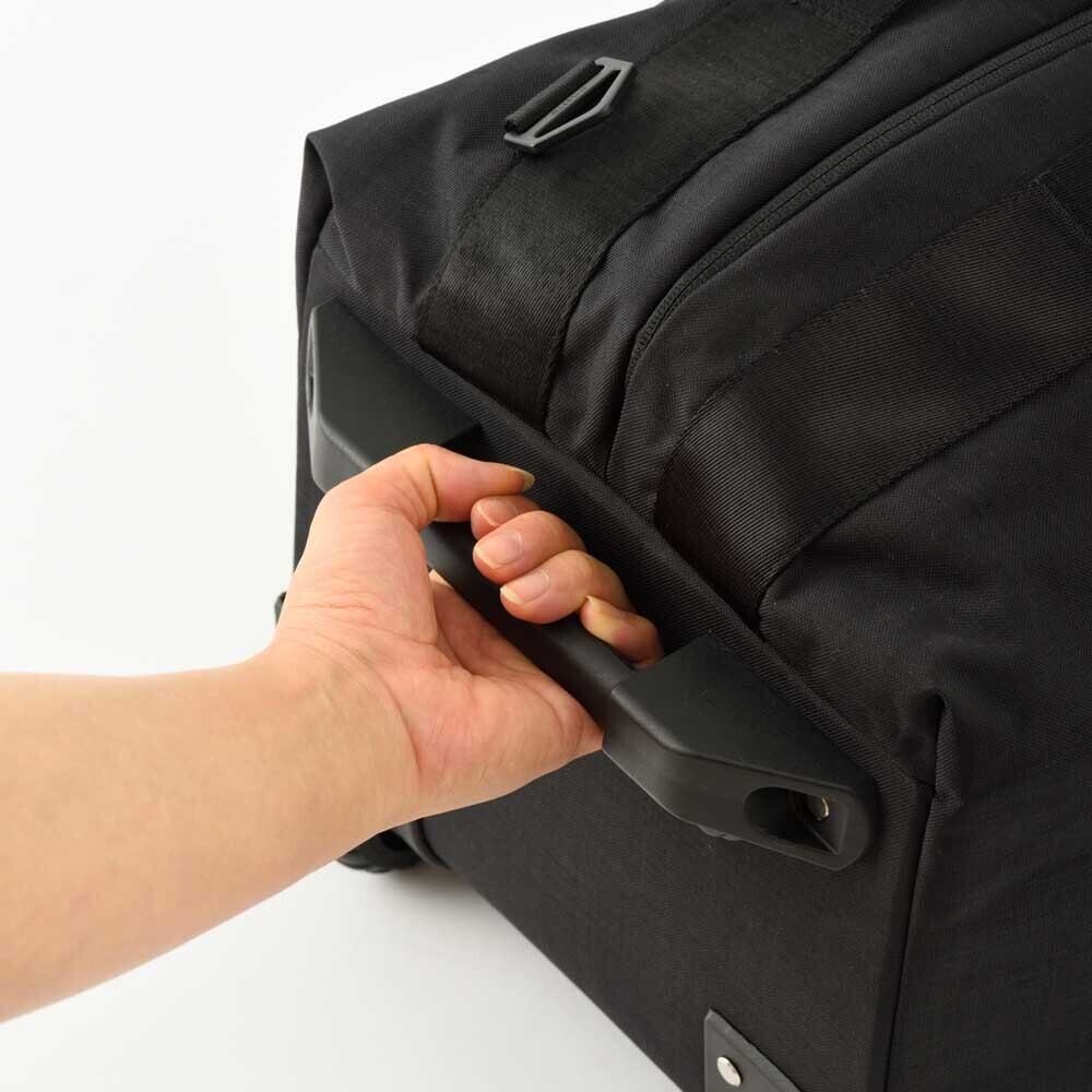 キャリーバーを伸ばしてキャリーとして、収納して手持ちのボストンバッグとして、縦にも横にも取り付け可能な付属のショルダーストラップでショルダーバッグとしても活躍します。