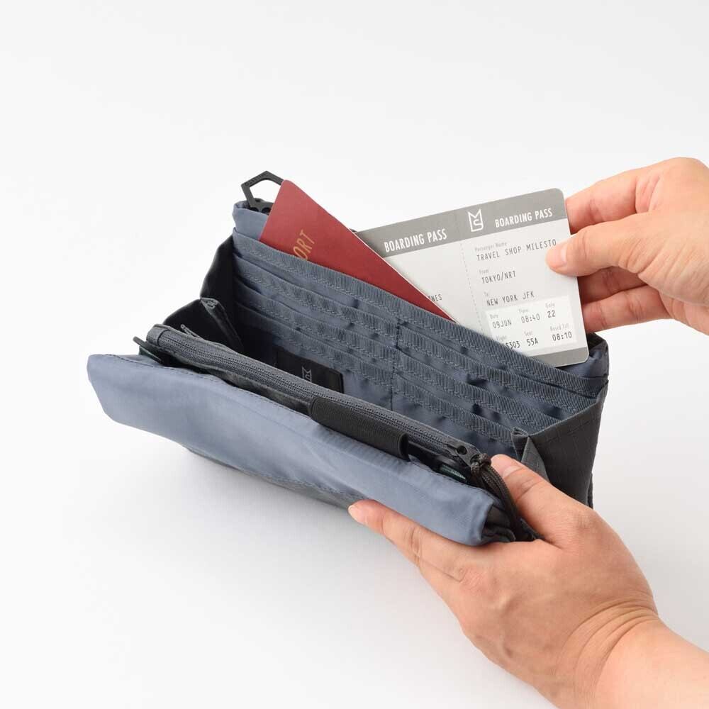 着脱式のポーチを付属し、硬貨やカード、パスポート、筆記具など、貴重品や旅の必需品もすっきり収納可能。