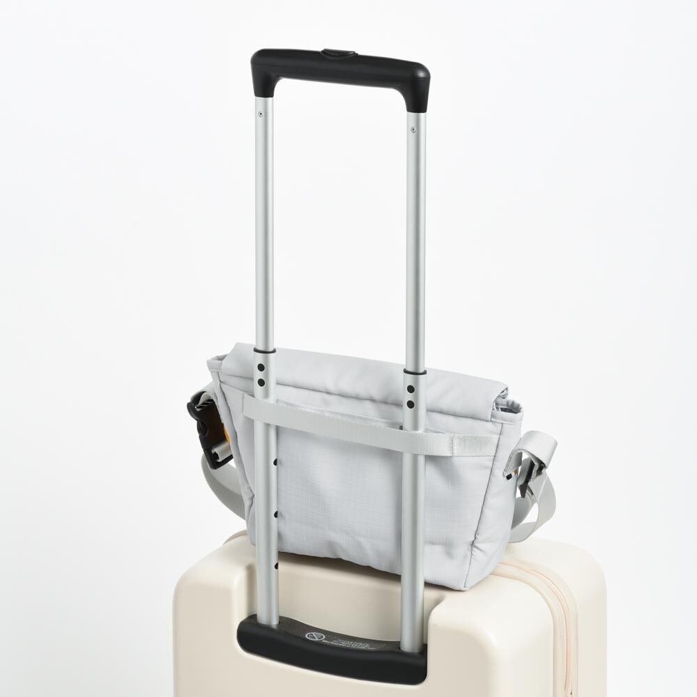 背面にはキャリーハンドルに固定できるベルト付きです。