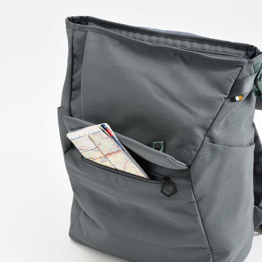 多角形を組み合わせた立体フォルムを生かし、各面にファスナーポケットやサイドポケット、背面ポケットなど用途に応じたポケットを整然と配置することで「収納力」に特化しました。