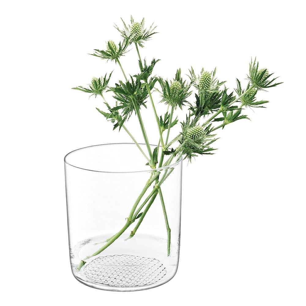 フラワーマーケットの編みかごにインスパイアされ、底にガラスの編み目がデザインされた質感のある花瓶。