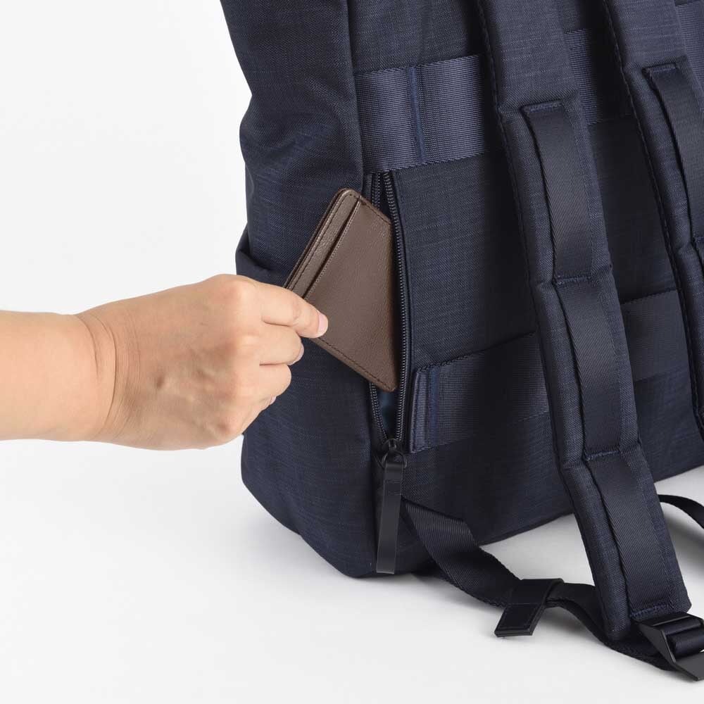 キャリーケースのハンドルに固定できる背面ベルト、背面からアクセスできるファスナーポケット付き。