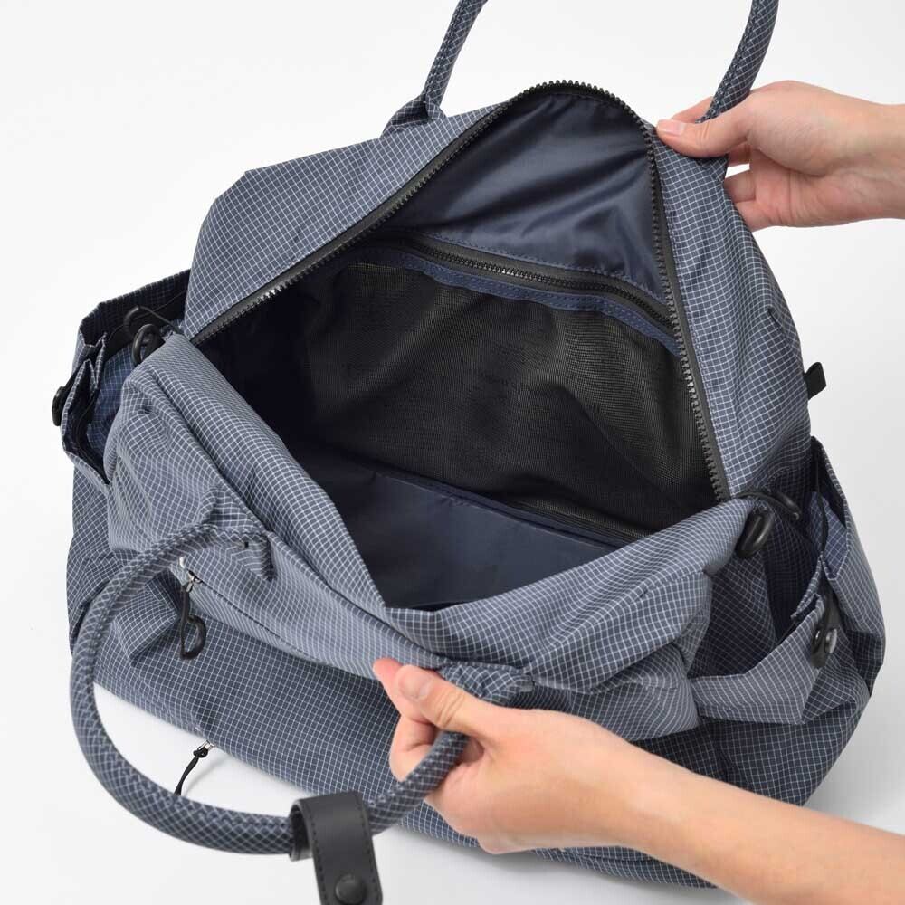 ワイドオープンで荷物の出し入れがしやすく、ファスナーメッシュポケットと2つの小分けポケットですっきり収納上手。
