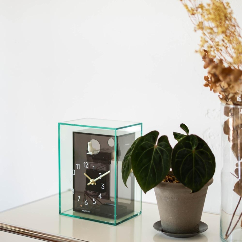 エッジの立った透明アクリルとスモークパネルの奥から、小さな鳩が時を告げる姿は、懐かしさと新しさを同時に感じさせます。